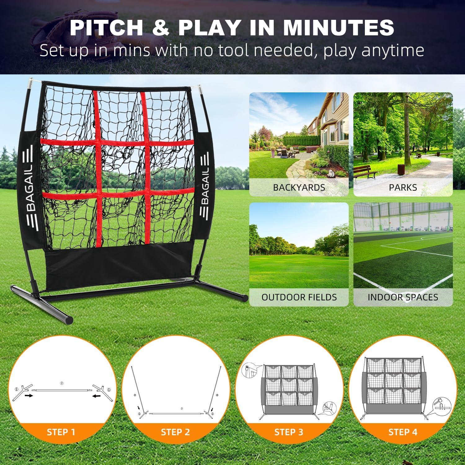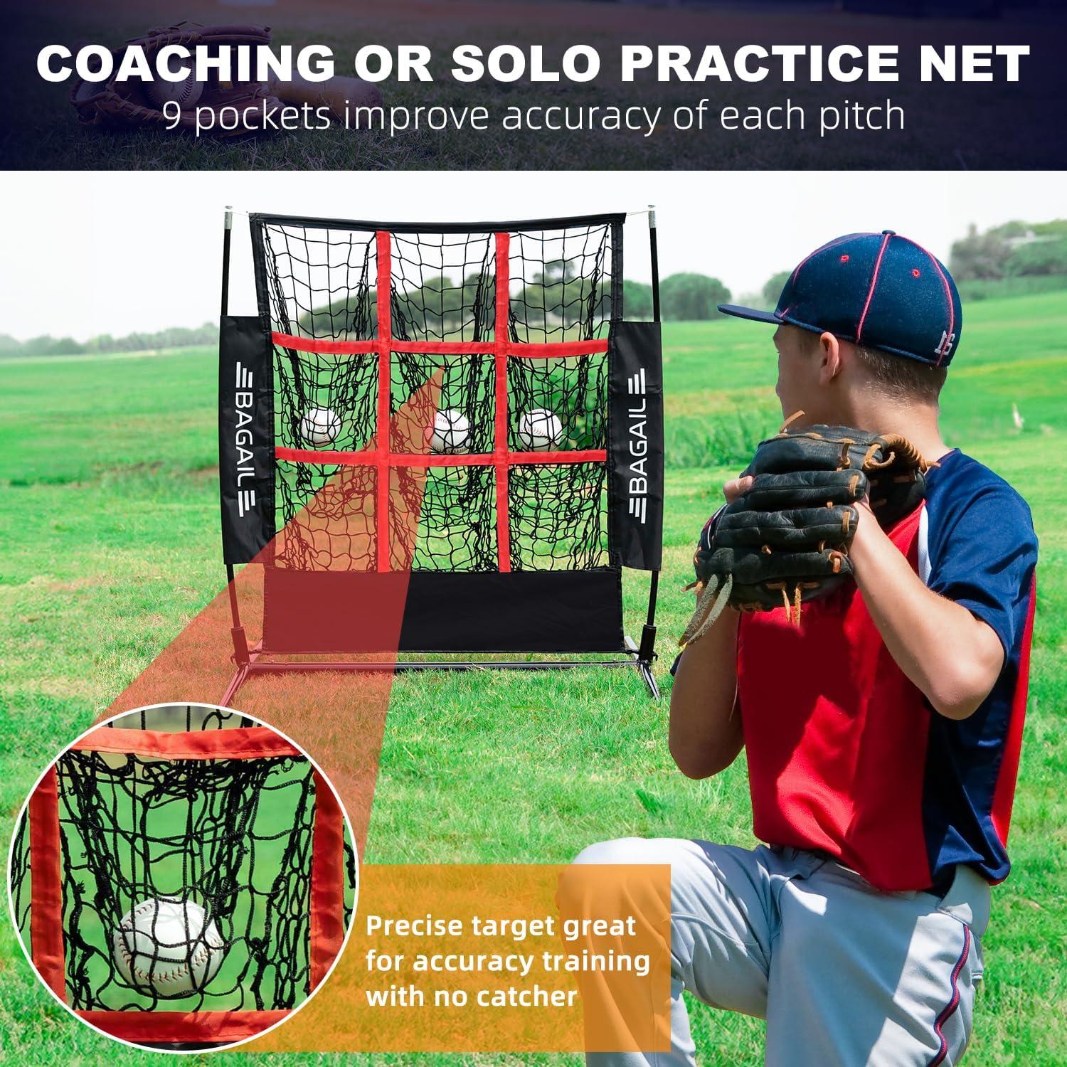 BAGAIL Baseball and Softball Pitching Net, 9 Pocket Pitching Net, Portable Pitching Target Net for Backyard with Carry Bag(Black+Red)
