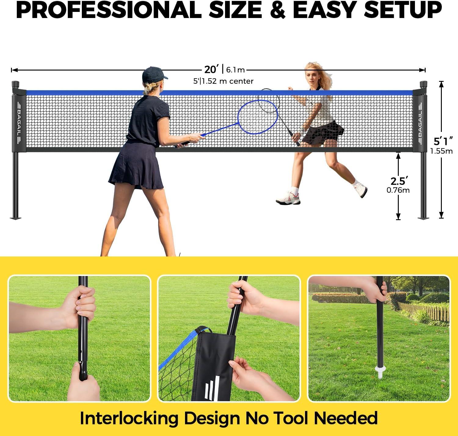 Official Tournament Standard: Meet regulation specs with a 20ft x 5.1ft net (LxH). Includes EVERYTHING: 1 knot-less PE net, 4 lightweight fiberglass rackets, 3 durable shuttlecocks, and a 600D Oxford carry bag. Ideal for 4-player family tournaments