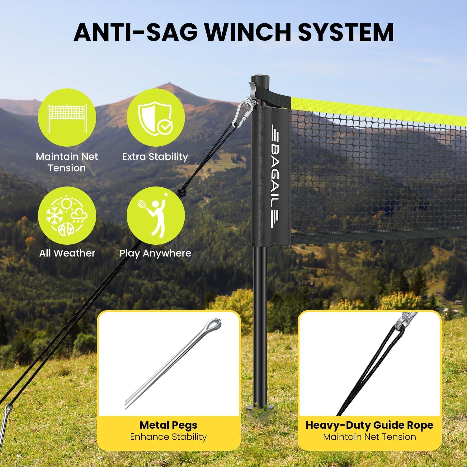 Pro-Grade Tension & Stability: Features an upgraded anti-sag winch system with 2 heavy-duty ropes and 4 rust-proof metal stakes, ensuring the net stays tournament-tight even during intense matches. No more sagging or readjustments!
